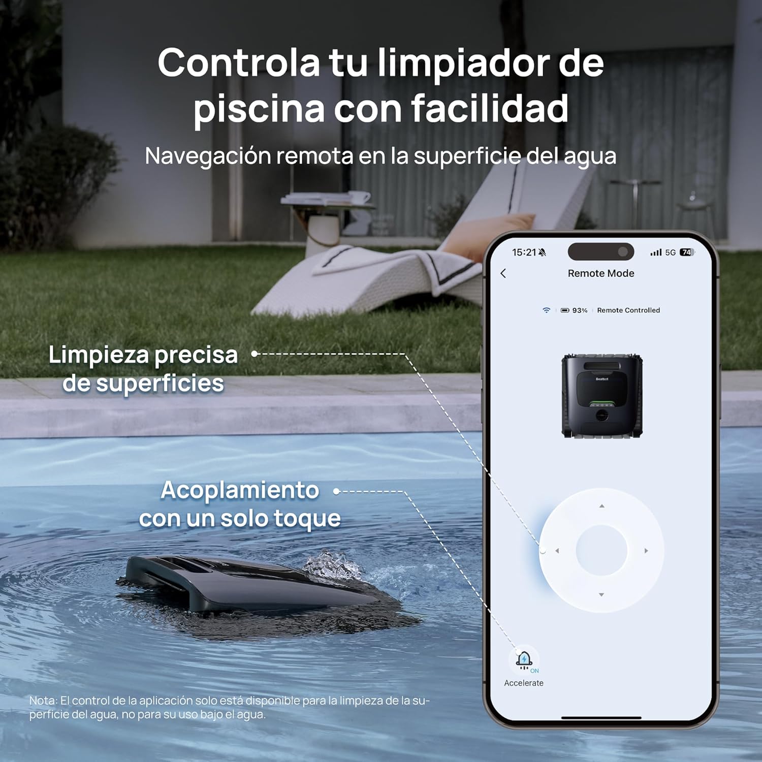 Desplazamiento con control remoto en la superficie: guíe sin esfuerzo la dirección del robot, acelérelo para alcanzar un objetivo de forma rápida y divertida, y devuélvalo a su base con un simple toque, todo todo desde la aplicación. Esta función, pionera en el sector, da como resultado una limpieza precisa de la superficie de zonas específicas. Controle su piscina como nunca antes había sido posible.